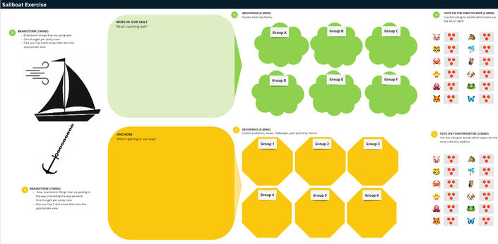 Your very own download of our ready to use Miro (online whiteboard) template that you can customize for hybrid or virtual team meetings, and that illustrates how to set up the exercise for an in-person meeting.